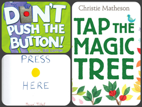 Collage of three picture books: Don’t Push the Button; Tap the Magic Tree; Press Here